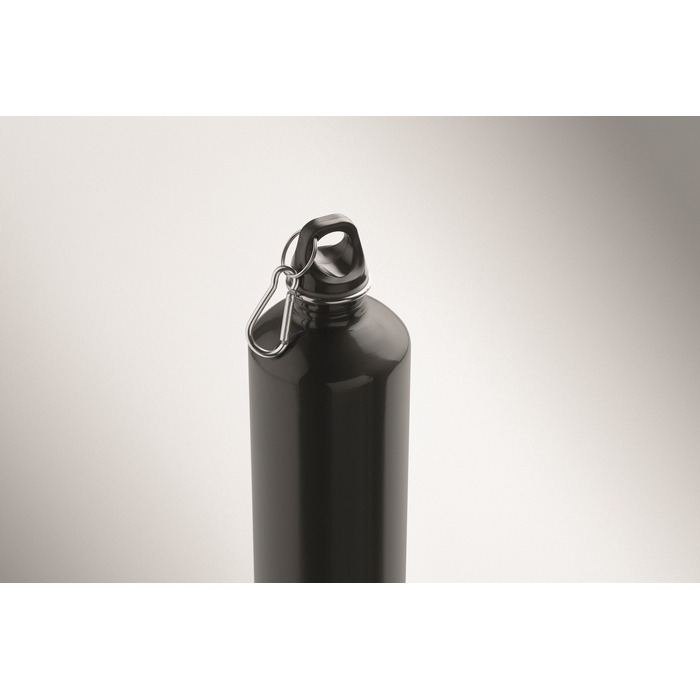 Single wall bottle (90% recycled stainless steel and 10% stainless steel) with a PP lid and carabiner. Capacity 1000 ml. As this is a single wall bottle, heat transfer can still occur. Dimensions: O8 x 26.4 cm