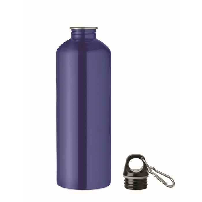 Single wall bottle (90% recycled stainless steel and 10% stainless steel) with a PP lid and carabiner. Capacity 1000 ml. As this is a single wall bottle, heat transfer can still occur. Dimensions: O8 x 26.4 cm