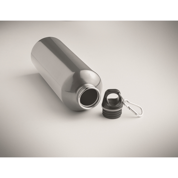 Single wall bottle (90% recycled stainless steel and 10% stainless steel) with a PP lid and carabiner. Capacity 1000 ml. As this is a single wall bottle, heat transfer can still occur. Dimensions: O8 x 26.4 cm