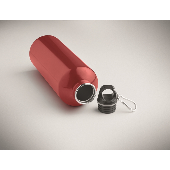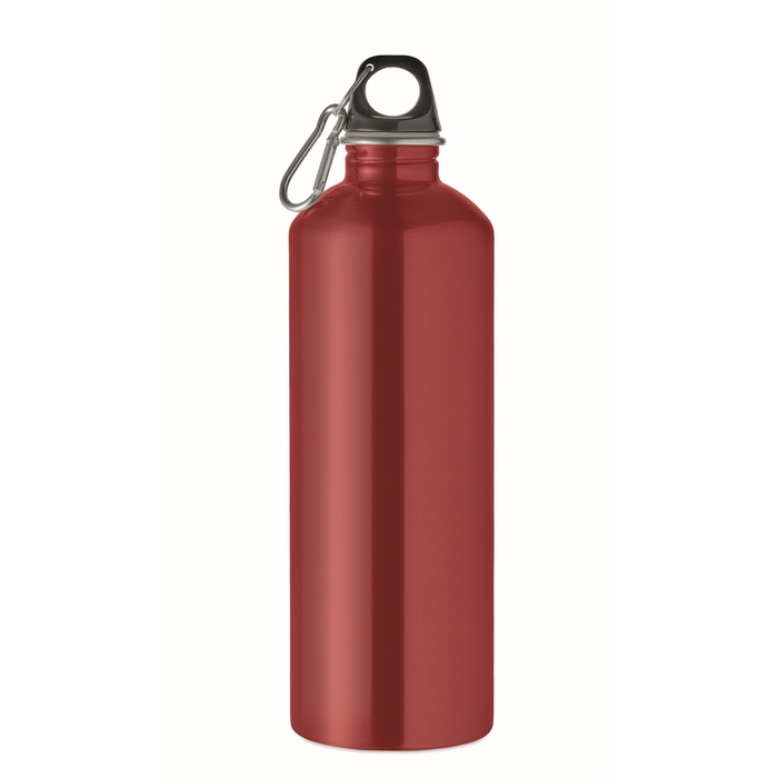 Single wall bottle (90% recycled stainless steel and 10% stainless steel) with a PP lid and carabiner. Capacity 1000 ml. As this is a single wall bottle, heat transfer can still occur. Dimensions: O8 x 26.4 cm