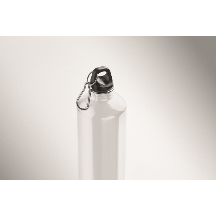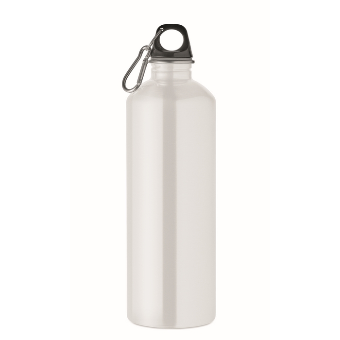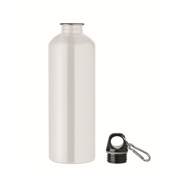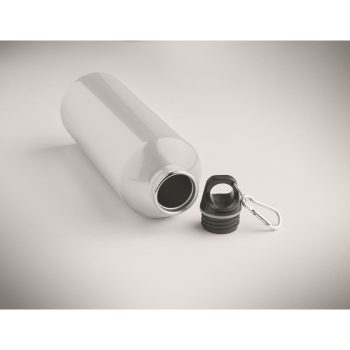 Single wall bottle (90% recycled stainless steel and 10% stainless steel) with a PP lid and carabiner. Capacity 1000 ml. As this is a single wall bottle, heat transfer can still occur. Dimensions: O8 x 26.4 cm
