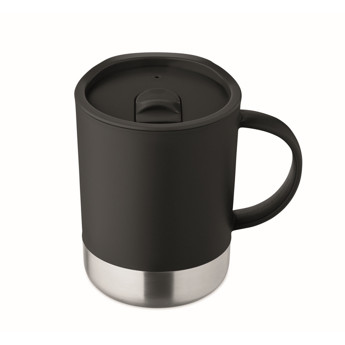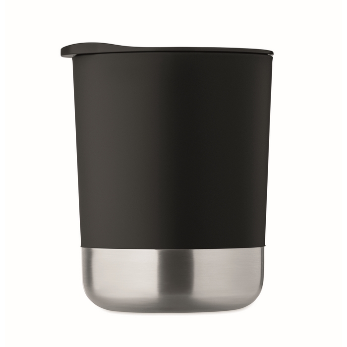 PP mug with recycled stainless steel base (90 % recycled stainless steel and 10% stainless steel) and PP sliding lid. Capacity: 300 ml. Dimensions: 11.2 x 10 cm