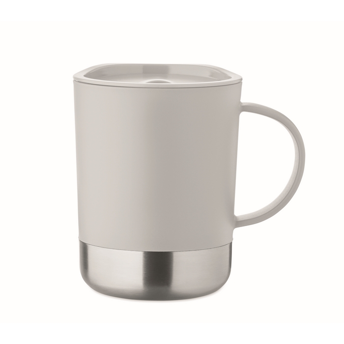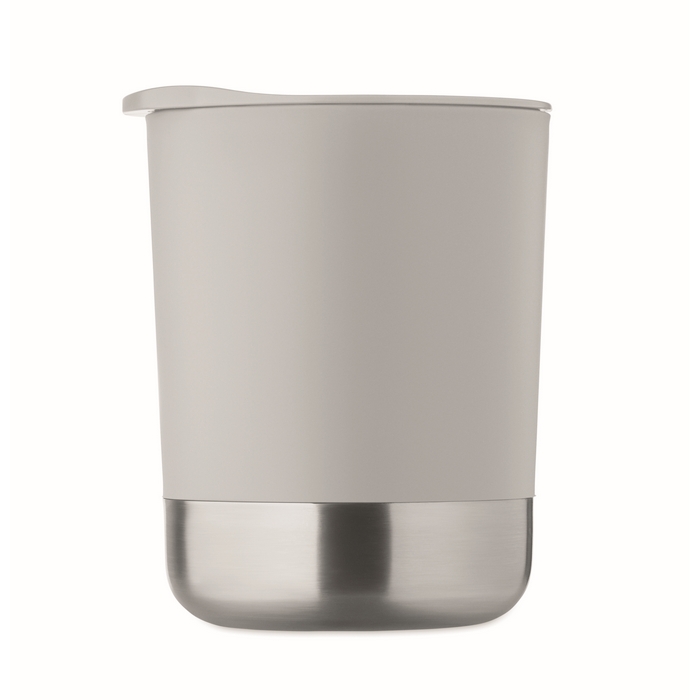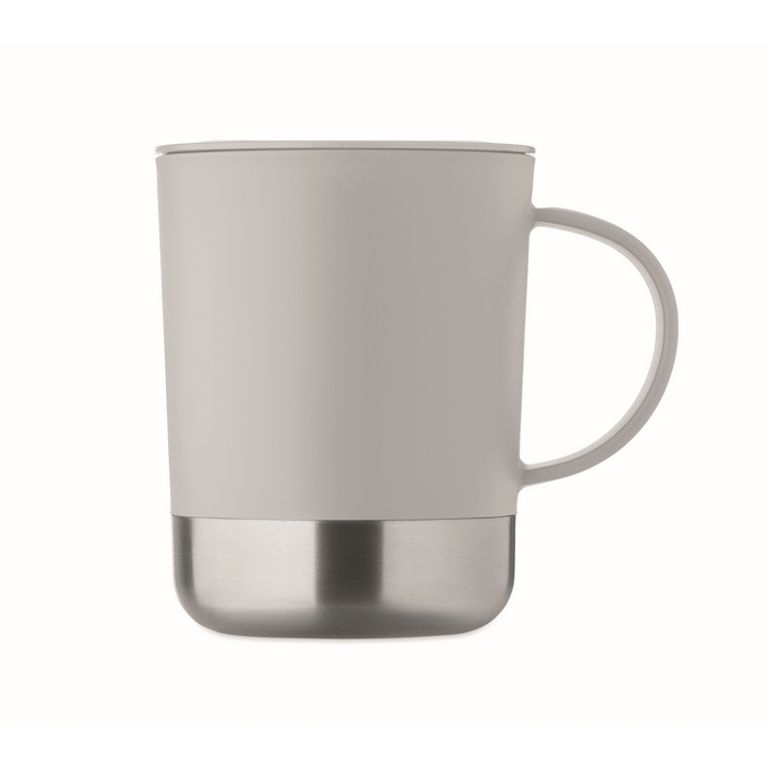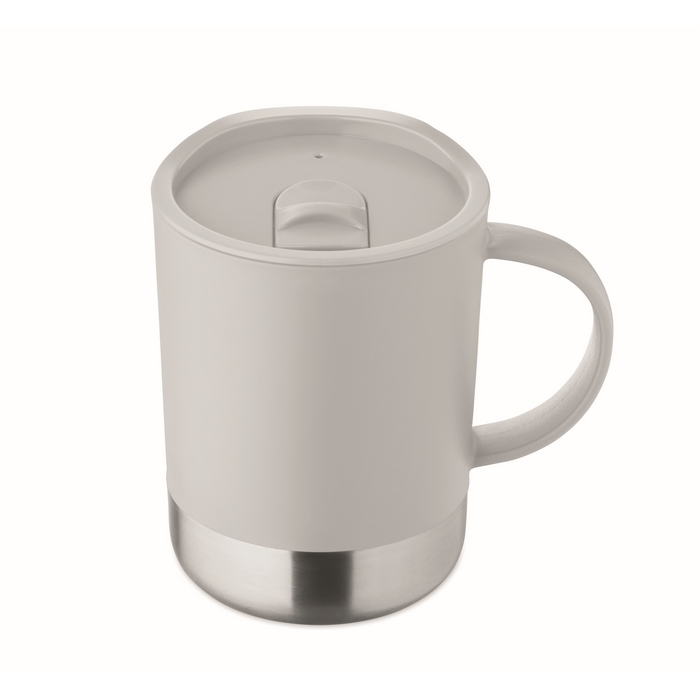 PP mug with recycled stainless steel base (90 % recycled stainless steel and 10% stainless steel) and PP sliding lid. Capacity: 300 ml. Dimensions: 11.2 x 10 cm