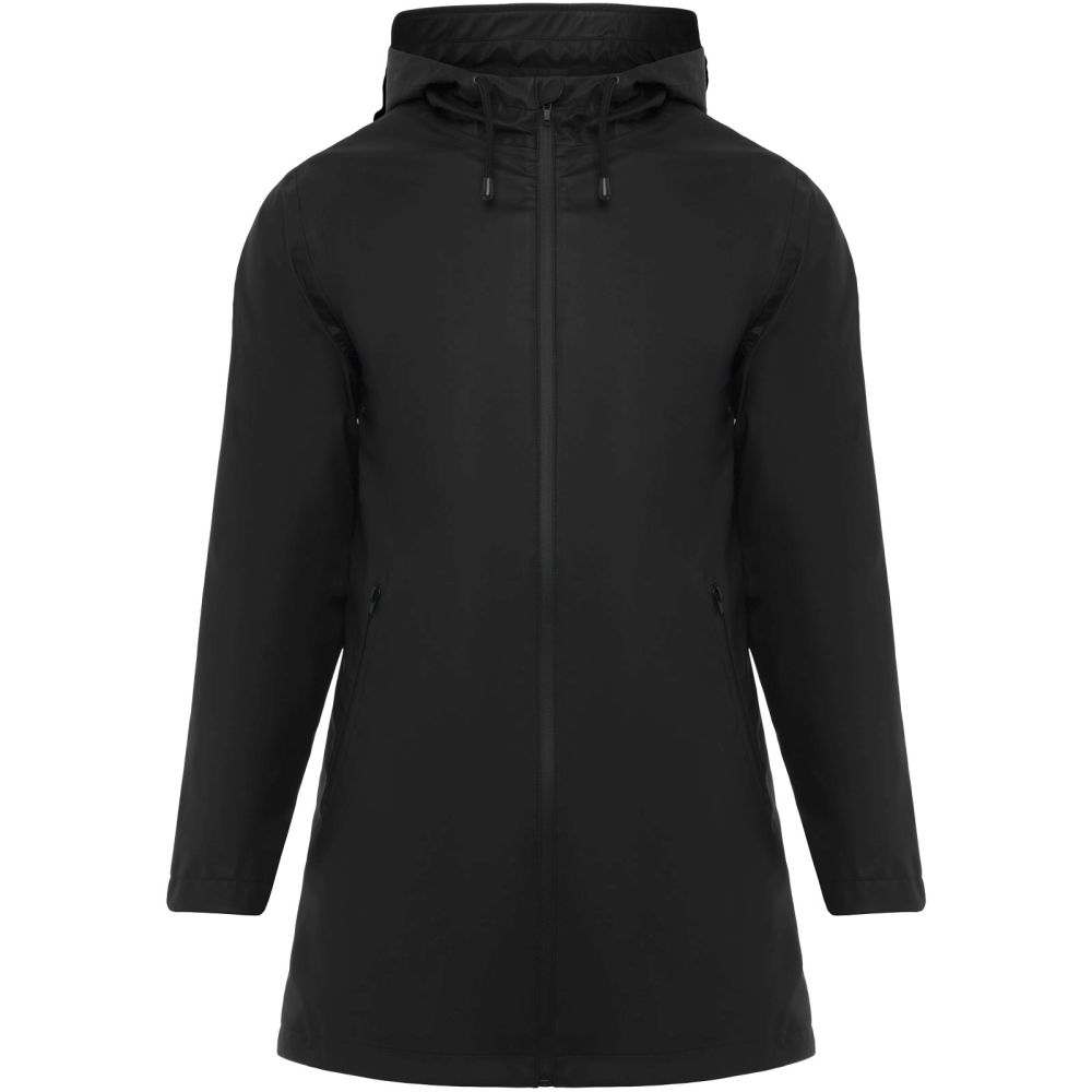 Waterproof raincoat for women. Hood with peak. Heat-sealed zips and seams. Contrasting details in black. Two side pockets with zip. Slit on back hem. Removable label. Waterproof. The model is 179 cm and is wearing size S.