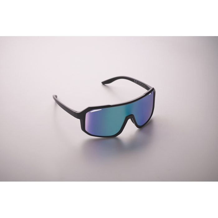 Sports sunglasses with mirrored lenses and colour frame. UV400 protection. Dimensions: 14.7 x 5.8 x 12.8 cm