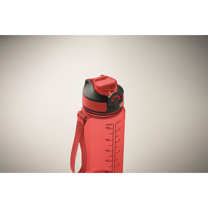 Motivational sports water bottle in RPET with integrated straw, soft silicone mouth piece, one hand opening flip top lid, safety lock. With carrying strap in RPET satin. Capacity 700 ml. Leak free. Dimensions: O7.7 x 21.5 cm