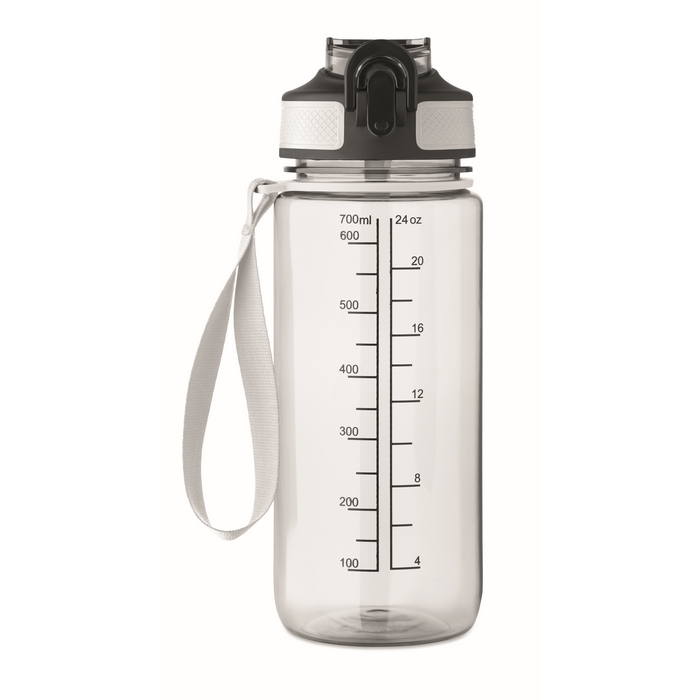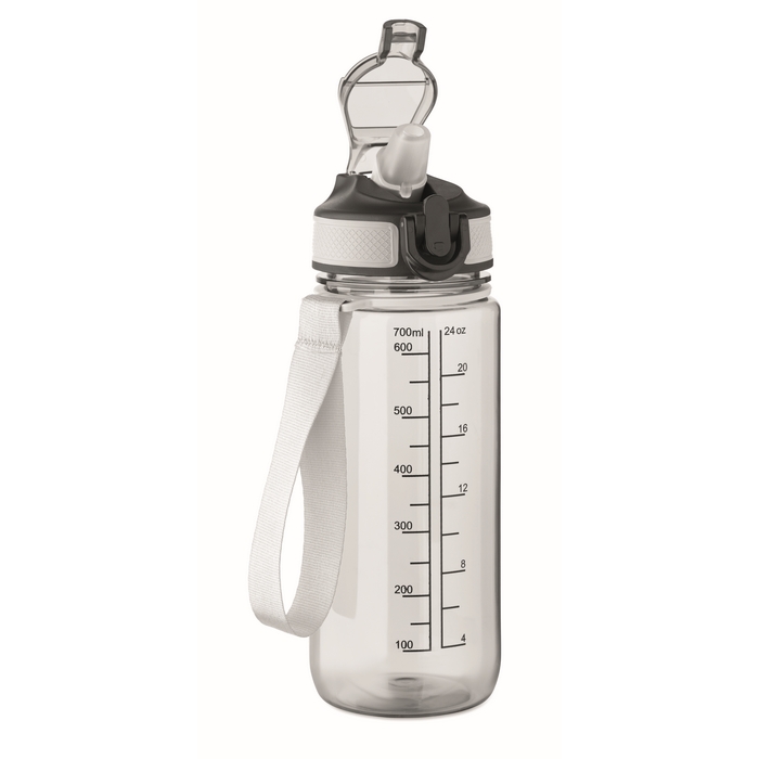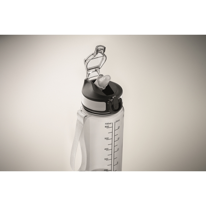 Motivational sports water bottle in RPET with integrated straw, soft silicone mouth piece, one hand opening flip top lid, safety lock. With carrying strap in RPET satin. Capacity 700 ml. Leak free. Dimensions: O7.7 x 21.5 cm