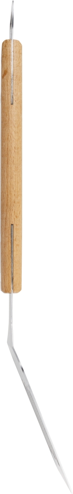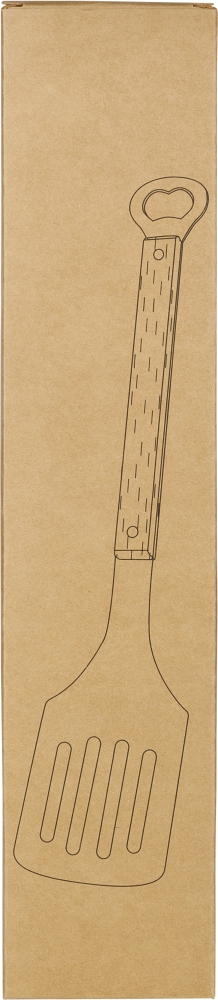 Stainless steel barbecue spatula with beechwood handle and integrated bottle opener at the end. Individually packaged in a brown cardboard box. Dimensions: 16 cm x 365 cm