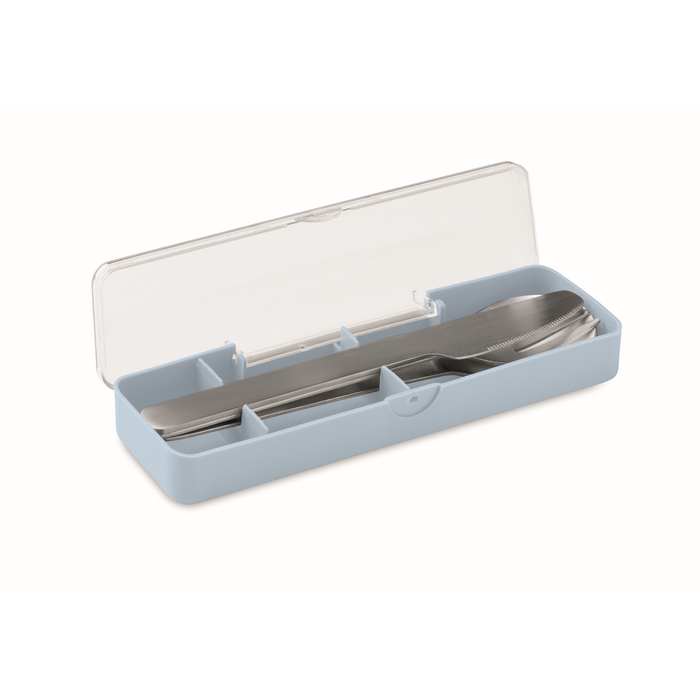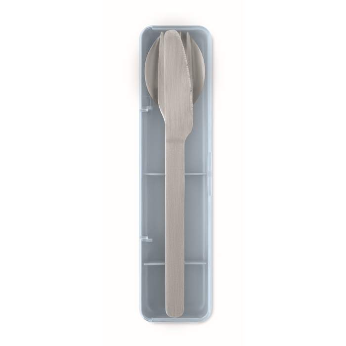 Stainless steel cutlery set with PP case. This set includes a fork, knife and spoon. Dimensions: 19.5 x 5.2 x 2 cm