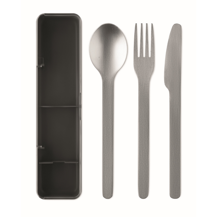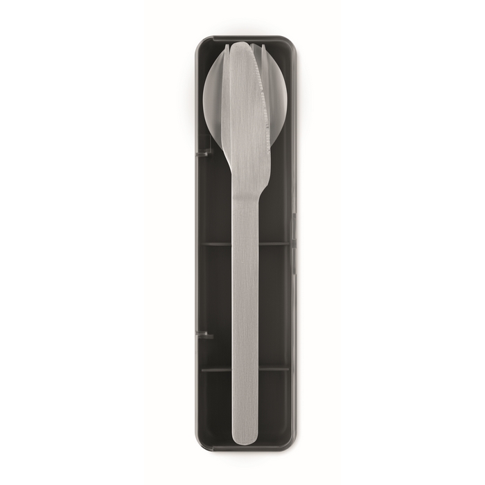 Stainless steel cutlery set with PP case. This set includes a fork, knife and spoon. Dimensions: 19.5 x 5.2 x 2 cm
