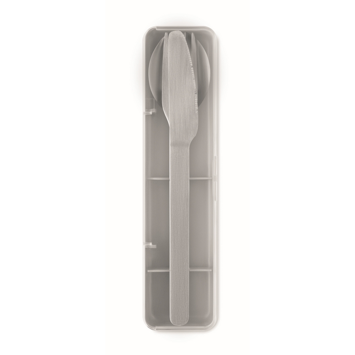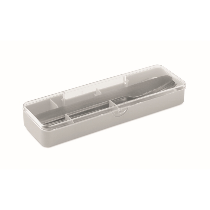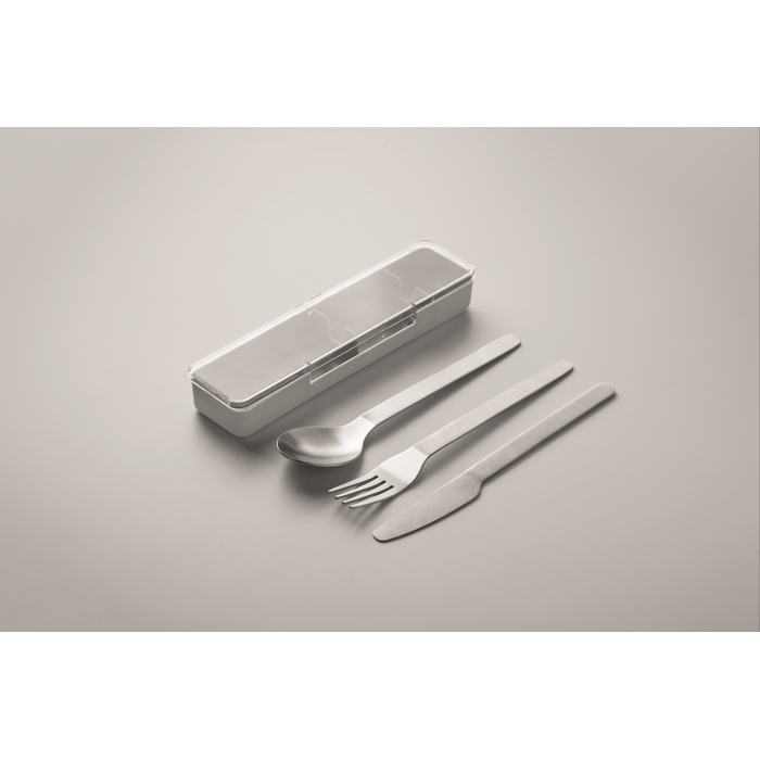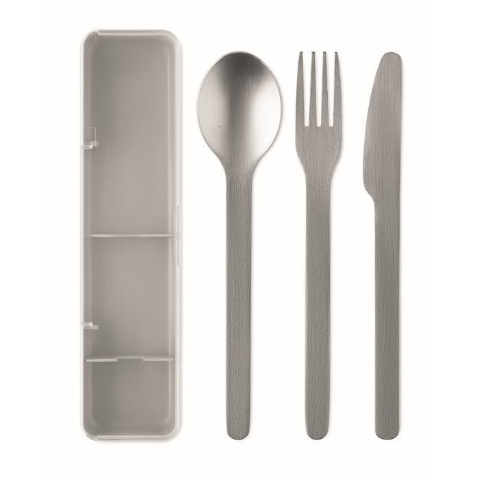 Stainless steel cutlery set with PP case. This set includes a fork, knife and spoon. Dimensions: 19.5 x 5.2 x 2 cm