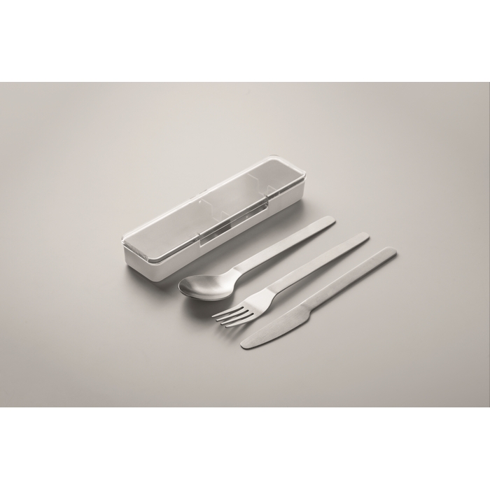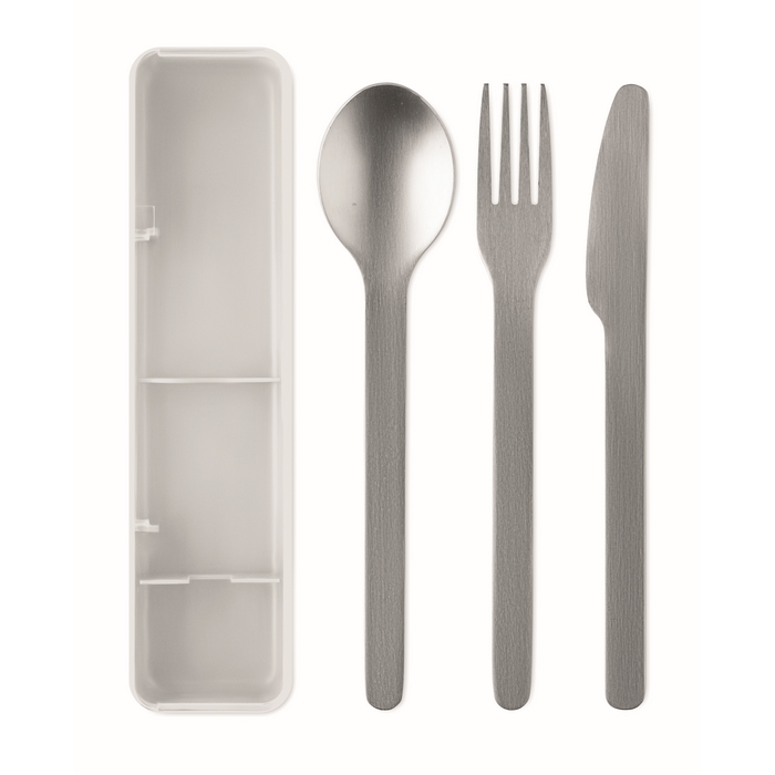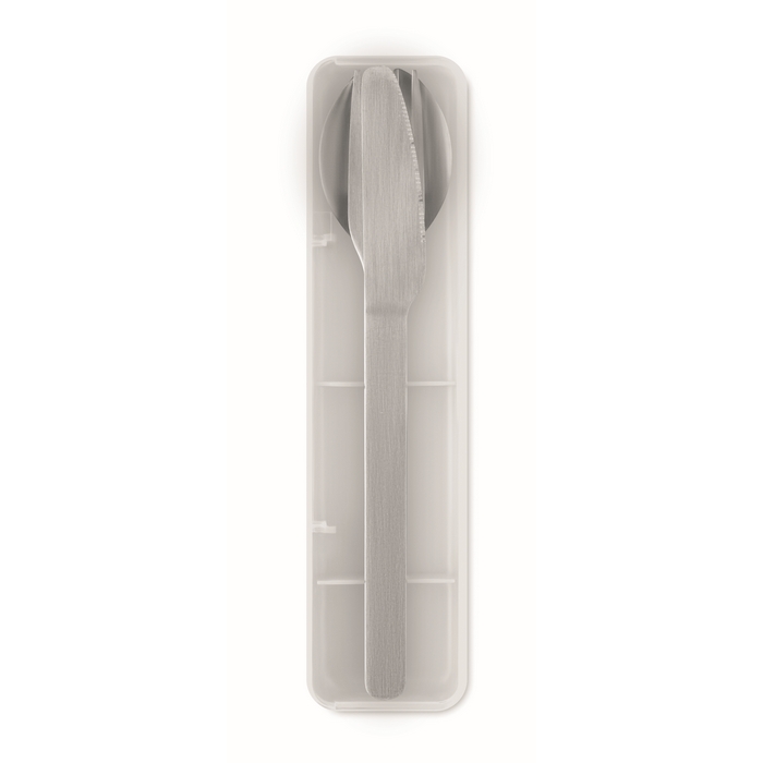 Stainless steel cutlery set with PP case. This set includes a fork, knife and spoon. Dimensions: 19.5 x 5.2 x 2 cm