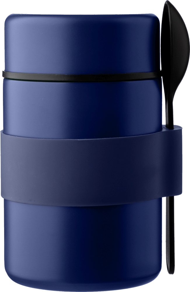 Stainless steel double-walled lunch pot (460 ml) including black PP spoon and silicone grip in matching color of the pot. Inside stainless steel 304 and outside stainless steel 201. It comes with a PP lid. Packaged per piece in a brown carton box. Dimensions: 8,5 cm x 15,5 cm x 10,5 cm