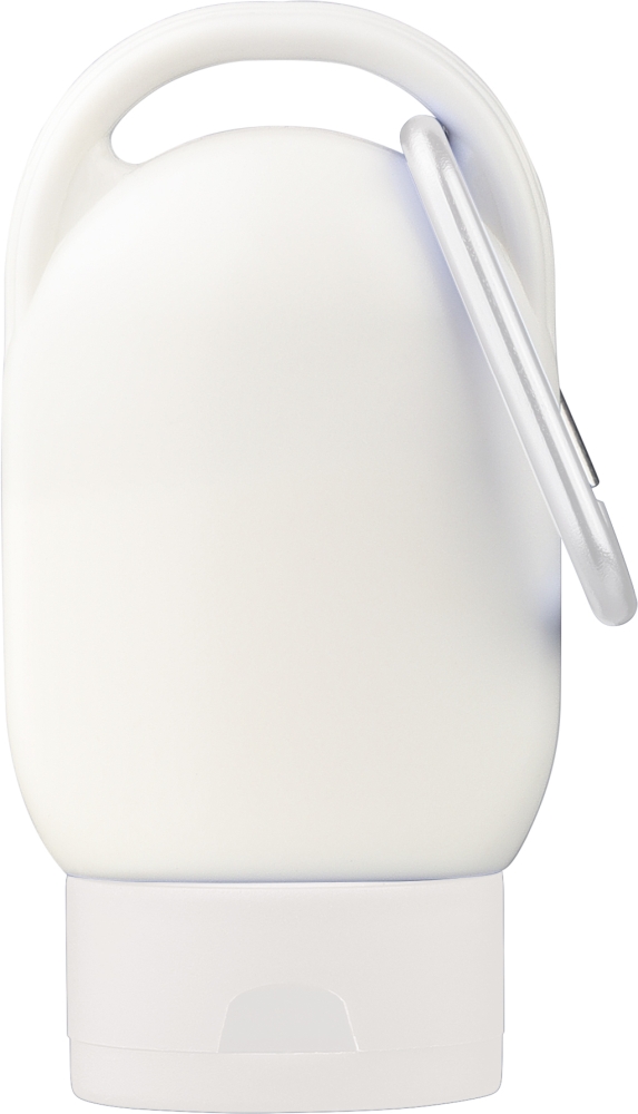 Sunscreen lotion with SPF30 in a 30 ml tube. Features a colored cap and matching carabiner for easy attachment. Backside includes ingredient list and best-before date. Shelf life of 2 years. Dimensions: 9,3 cm x 5 cm