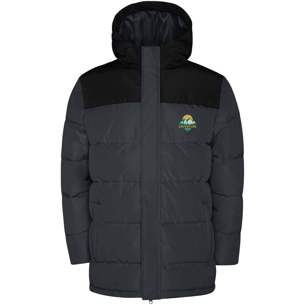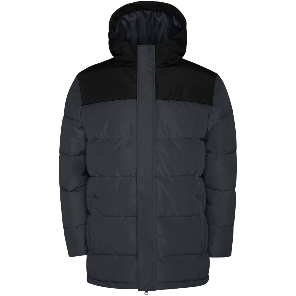 Padded jacket with fixed hood. Front zipper covered with a placket. Chin guard. Two side pockets with zip. Elastic cuffs.