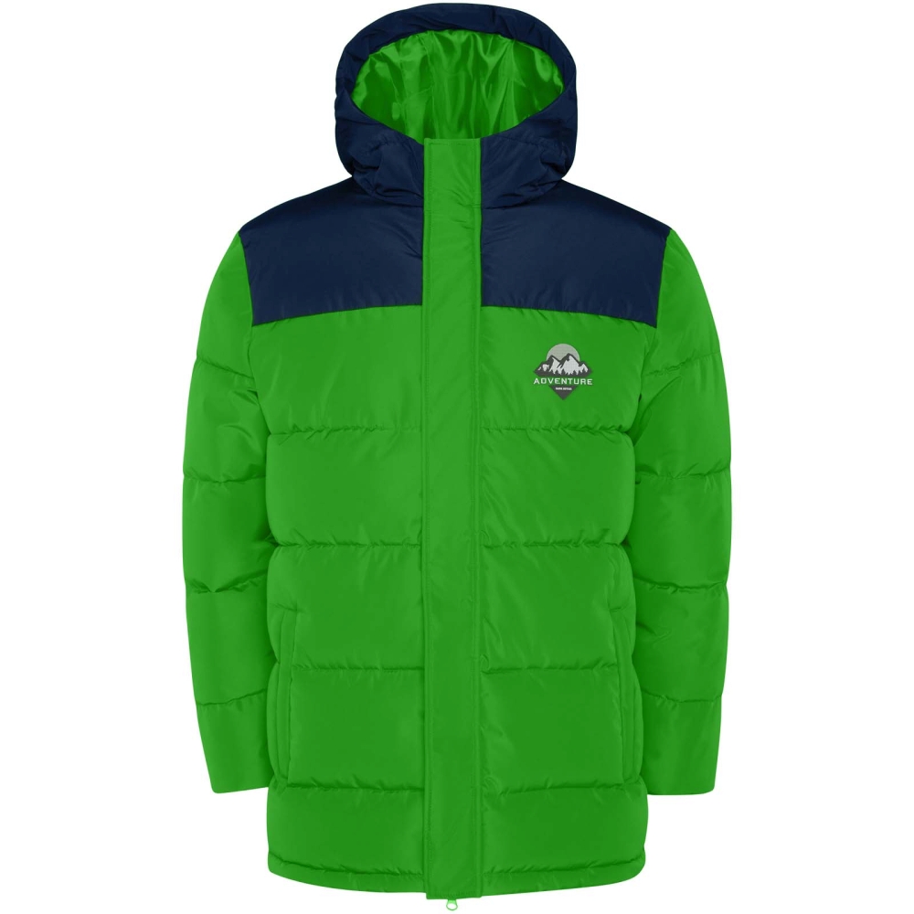 Padded jacket with fixed hood. Front zipper covered with a placket. Chin guard. Two side pockets with zip. Elastic cuffs.
