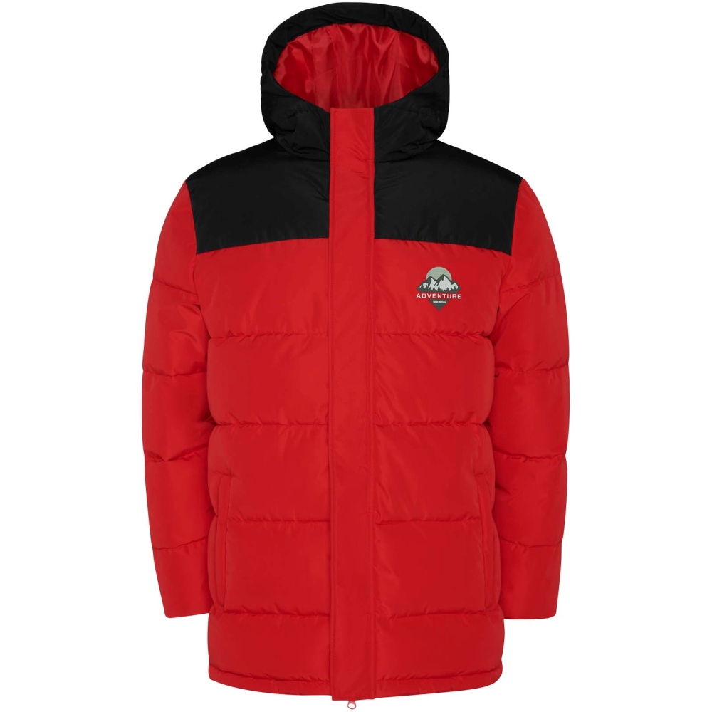 Padded jacket with fixed hood. Front zipper covered with a placket. Chin guard. Two side pockets with zip. Elastic cuffs.