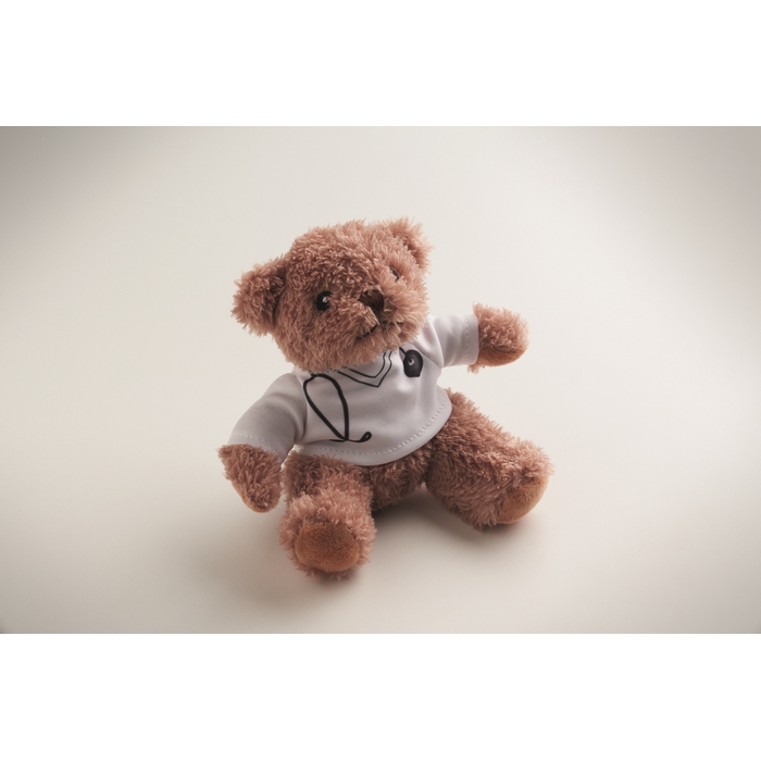 Polyester teddy bear plush dressed as a doctor with white printed T-shirt. Embroidered eyes, nose and mouth. Dimensions: 13 x 16 cm