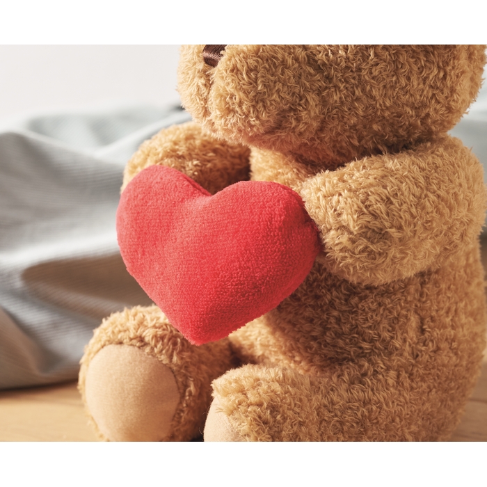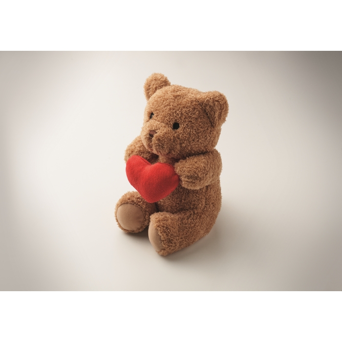 Polyester teddy bear plush holding a red heart, Embroidered eyes, nose and mouth. Rozměry: 23 cm