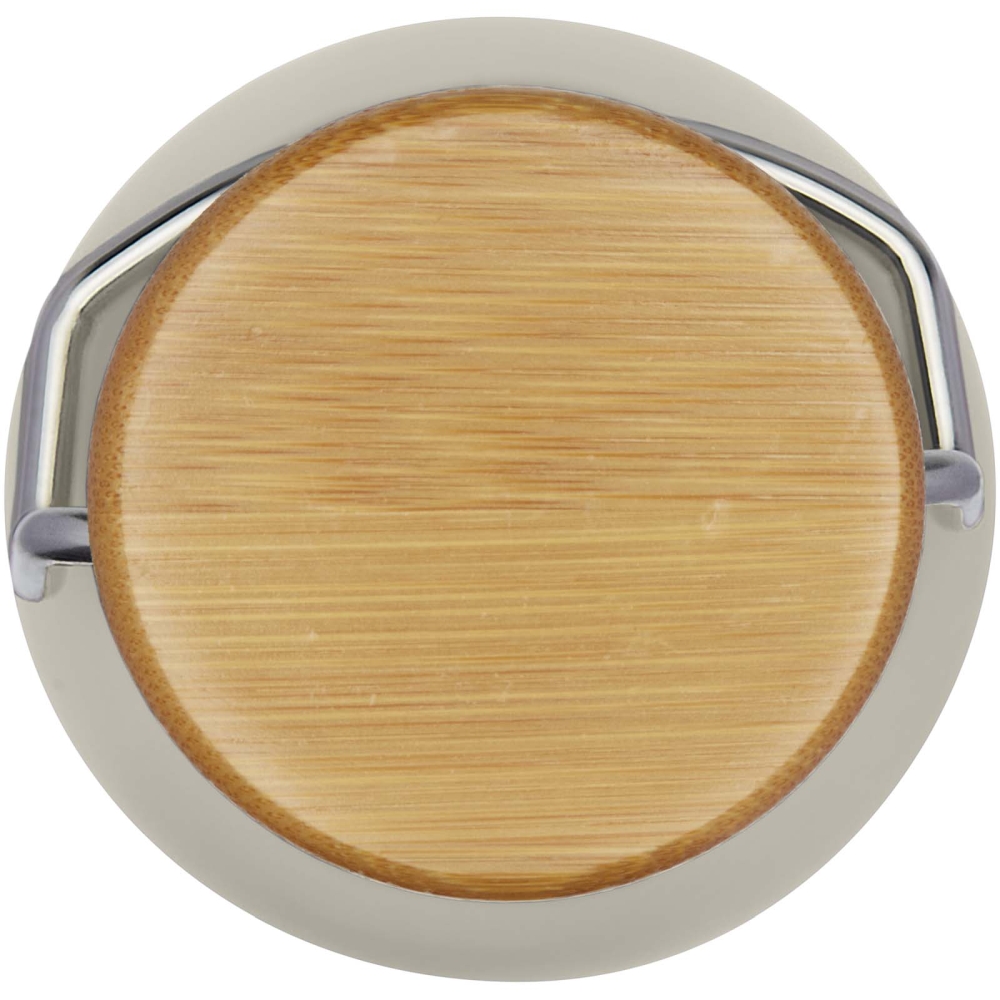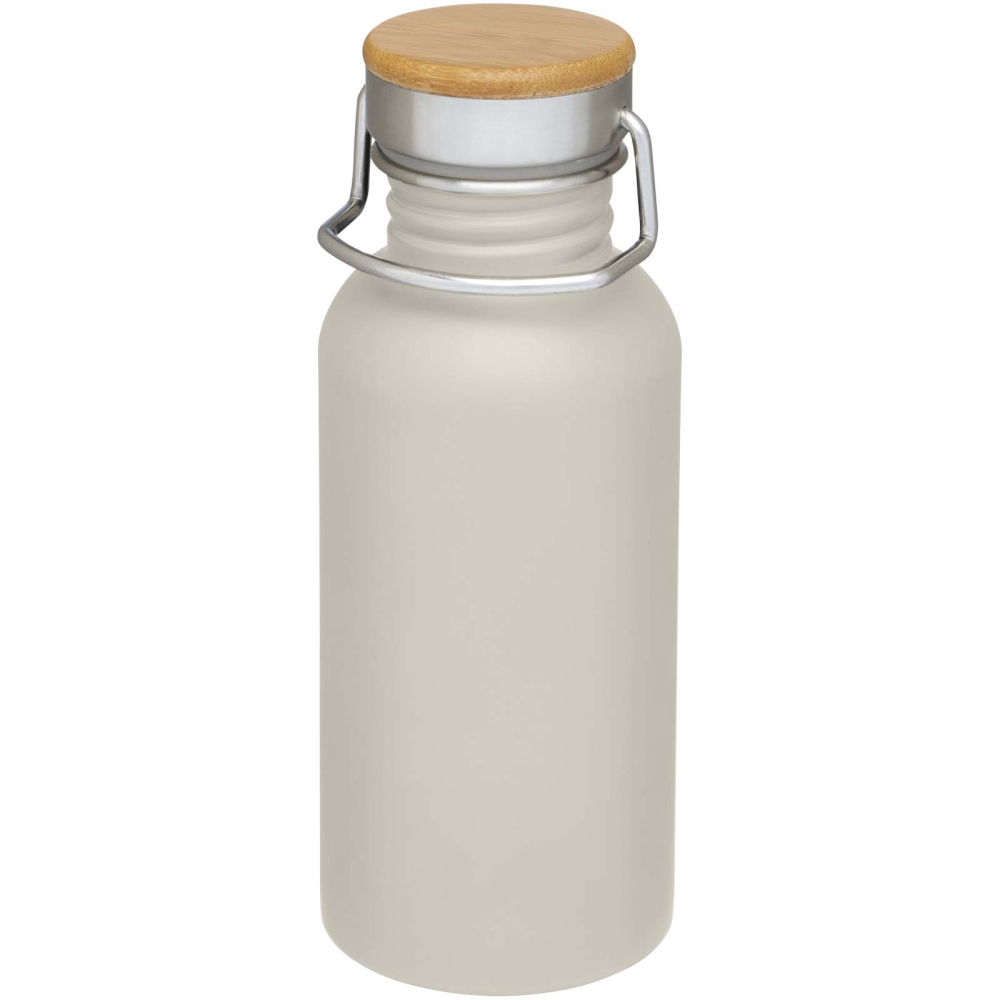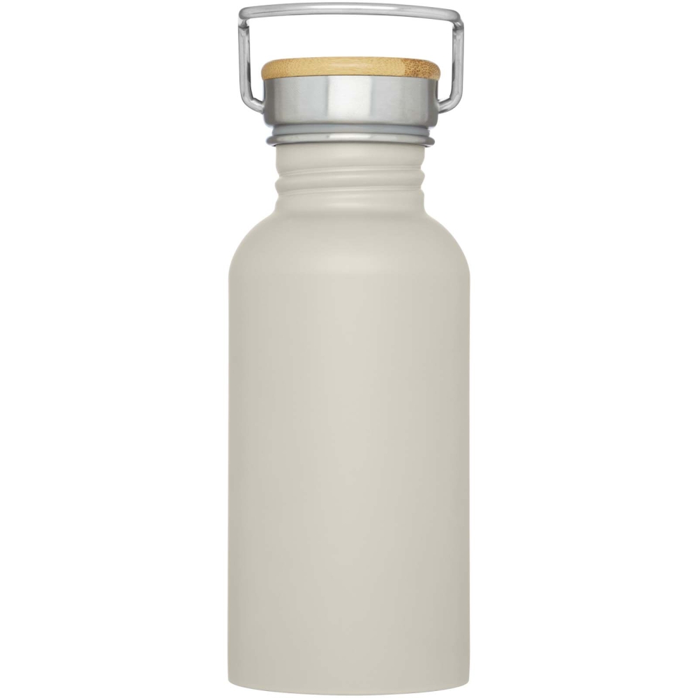 Single-walled stainless steel bottle with screw-on lid. The lid features a bamboo top, as well as a handle for easy carrying. Volume capacity is 550 ml. Presented in an Avenue gift box. Dimensions: 18,8 x O 7,4 cm