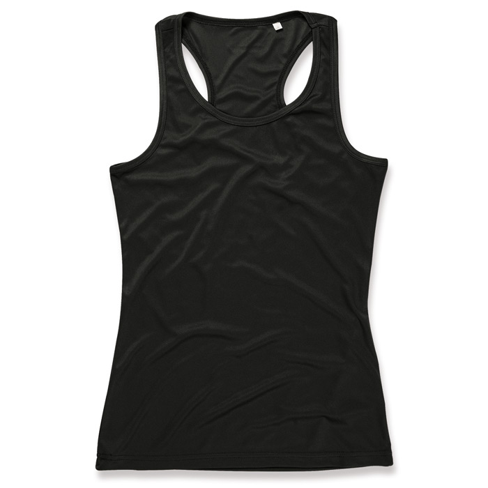 Sleeveless shirt for women, body fit, smooth and sleek fabric, side seams, neck drop and armholes with binding, racerback, small, reflecting ACTIVE-DRY logo on the back, small size label in the collar, care label in teh side seam. Material: 100% Active-Dry polyester interlock, 140 gsm. Sizes: S-M-L-XL.