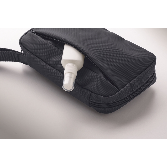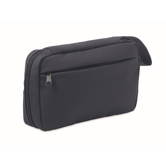 Toiletry bag in 600D RPET with PU coating, RPET mesh and 210D RPET lining. Features front zippered main compartment pocket, inner mesh and open pockets. Rozměry: 22 x 4 x 13 cm