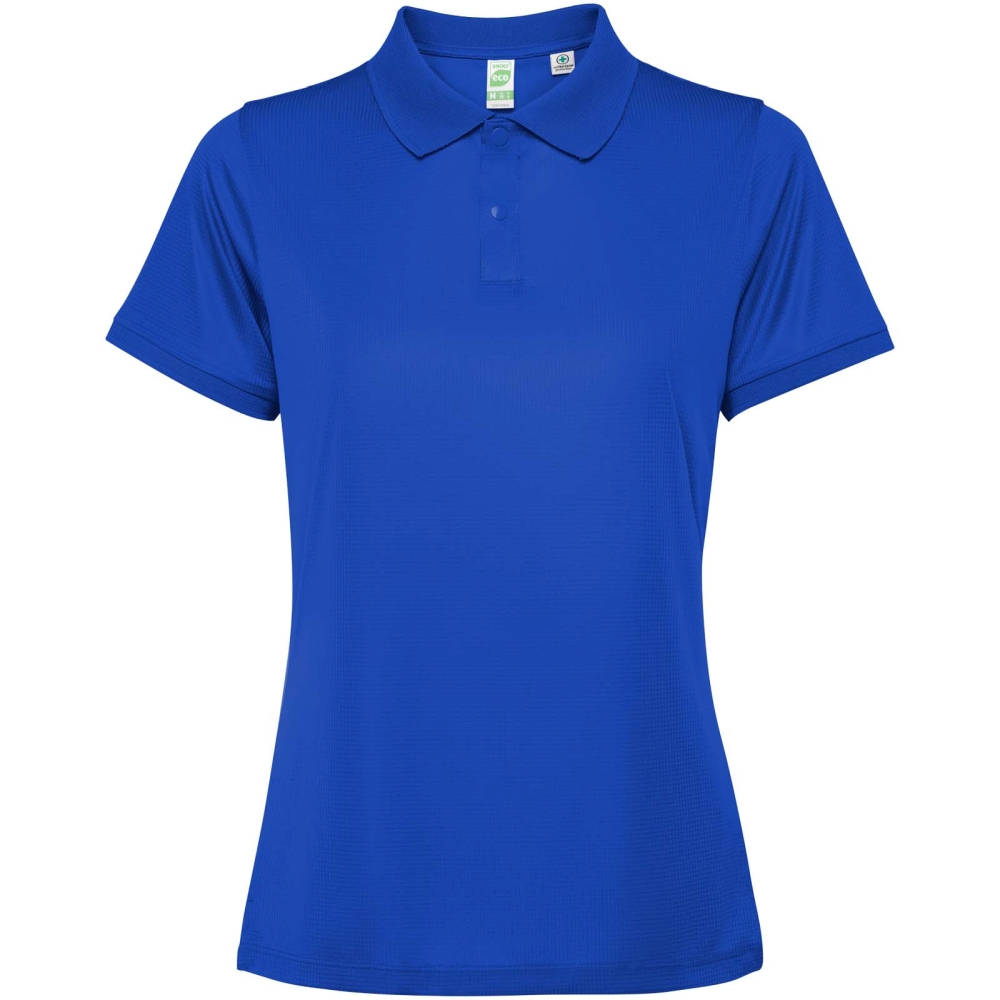 Short-sleeve fitted polo shirt for women. Reinforced covered seams in interior collar. 1x1 ribbed cuffs and collar. Side seams. 3-button placket and side slits.