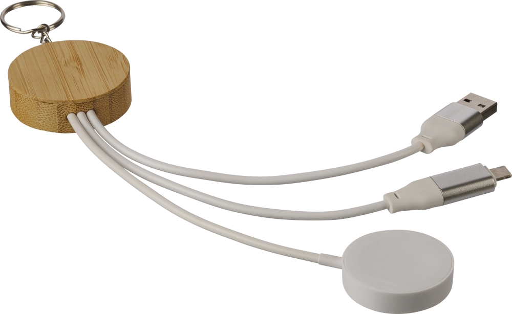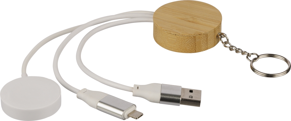TPE charging cable set with bamboo socket and metal keyring in a compact keychain design. Includes PD 65W fast charging cables (2-in-1 Type-C/Lightning and USB-A/USB-C) and a universal smartwatch charger. Packed in a brown cardboard box. Dimensions: 4,5 cm x 21 cm