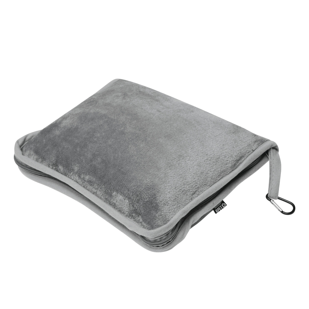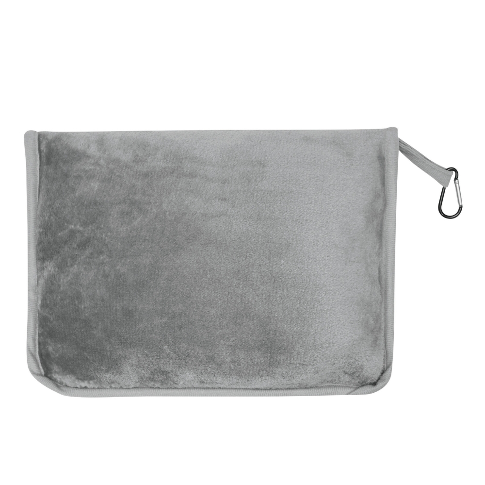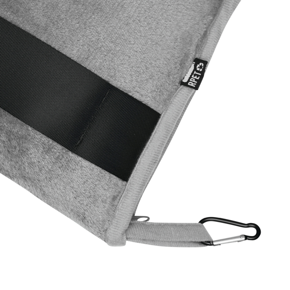 Travel blanket made of 100 % rPET, soft and cosy feel thanks to plush fleece, washable, in a bag with zipper closure, loop with small carabiner (the carabiner is NOT suitable for climbing) and trolley sleeve, blanket can be folded and used as a pillow inside the bag. Dimensions: 150 x 100 / 35 x 25 cm