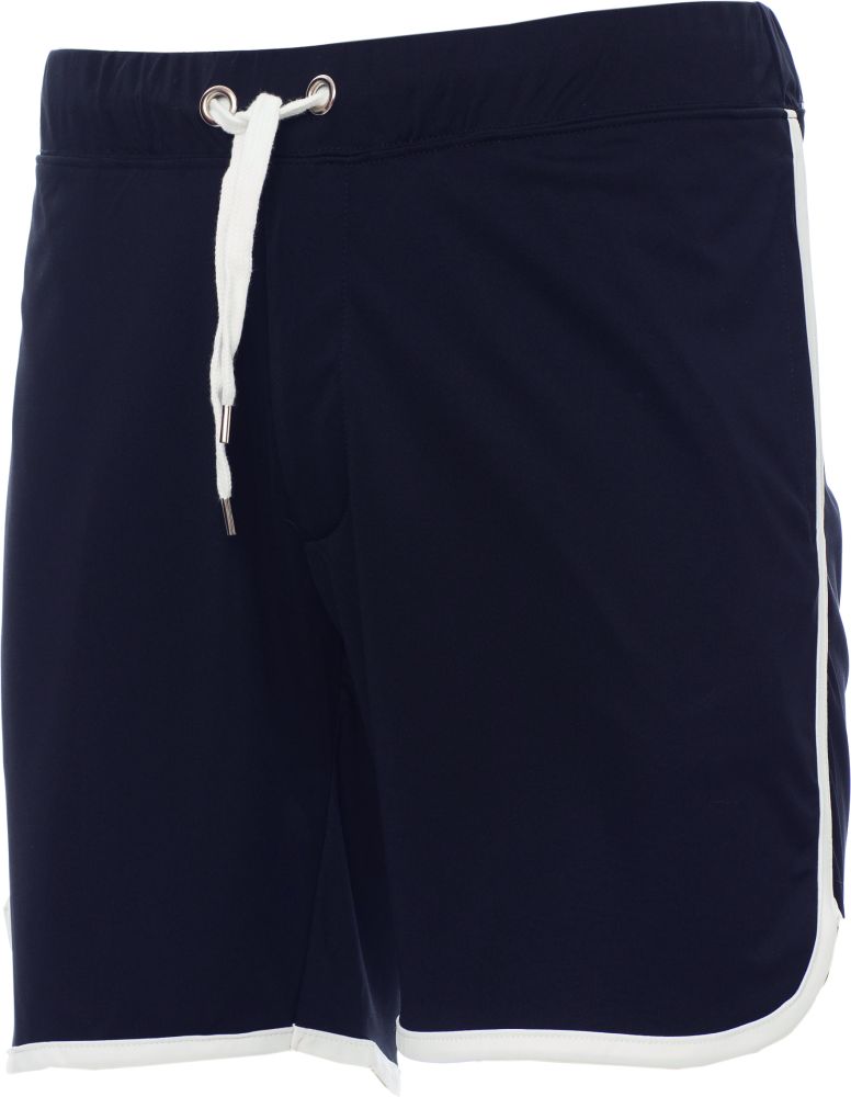 Unisex Bermuda sports shorts with drawstring waist, zipped flap, two side pockets and contrasting trim.