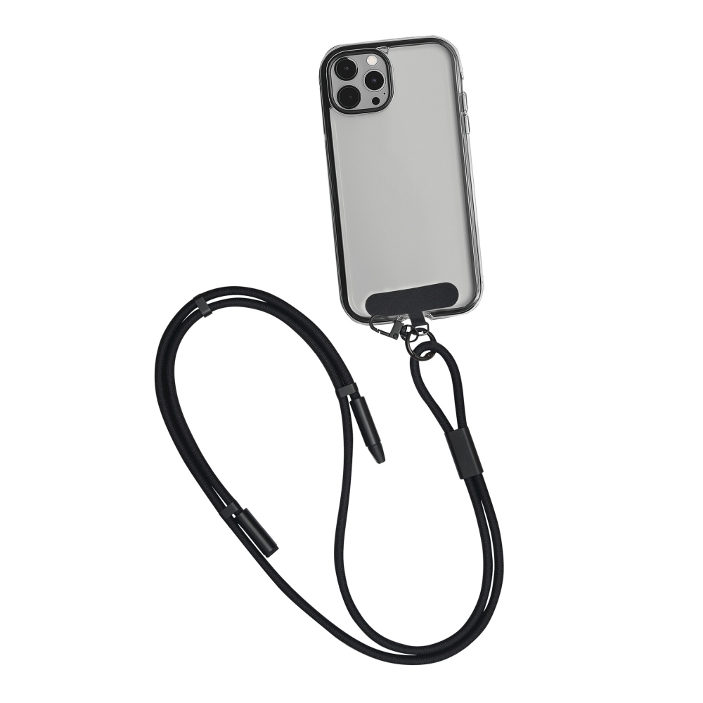 Universal phone lanyard for smartphones: with small patch to place between the phone and the case (only suitable for cases that offer all-around edge protection), small carabiner to attach keys etc., adjustable lanyard length (for wearing crossbody or as a necklace), lanyard is also a 65 W charging cable with data transmission, USB Type-C, cable with fabric coating (cable length approx. 144 cm). Dimensions: O0,6 x 77 cm