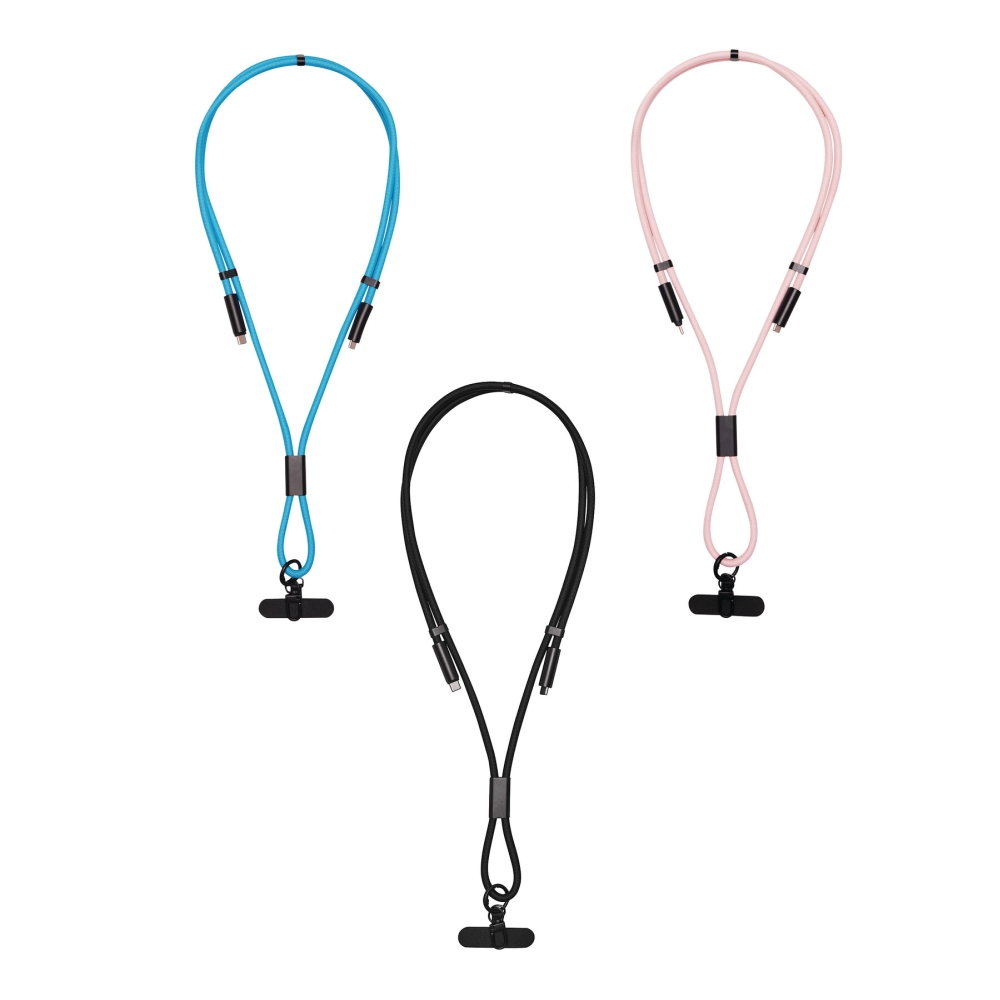 Universal phone lanyard for smartphones: with small patch to place between the phone and the case (only suitable for cases that offer all-around edge protection), small carabiner to attach keys etc., adjustable lanyard length (for wearing crossbody or as a necklace), lanyard is also a 65 W charging cable with data transmission, USB Type-C, cable with fabric coating (cable length approx. 144 cm). Dimensions: O0,6 x 77 cm