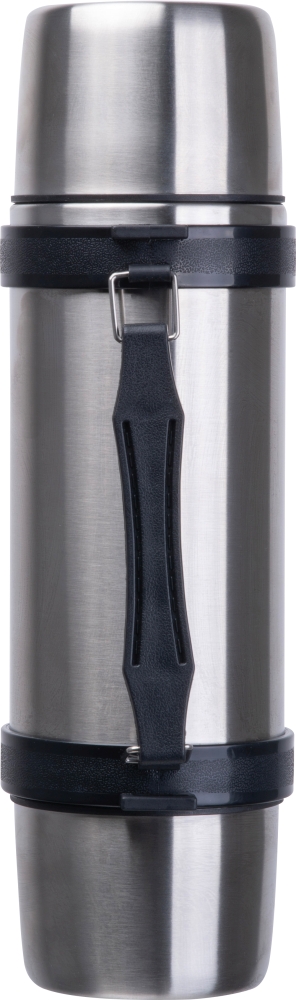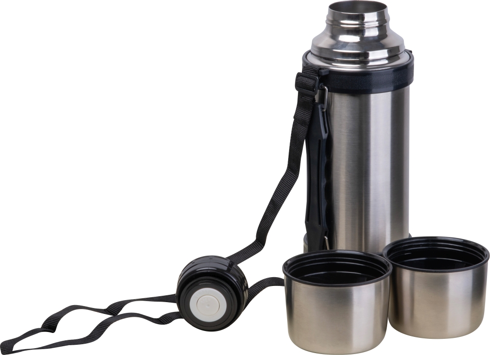 Robust 1000 ml vacuum insulated stainless steel flask with carrying strap and two integrated cups, ideal for on the go. Dimensions: o 9,8 x 33,5 cm