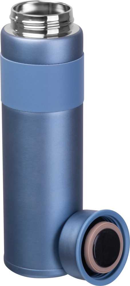 Double-walled vacuum stainless steel bottle with 600ml capacity. Ergonomically designed with a color-coordinated PU band for a comfortable grip. Dimensions: o 6,7 x 23,5 cm