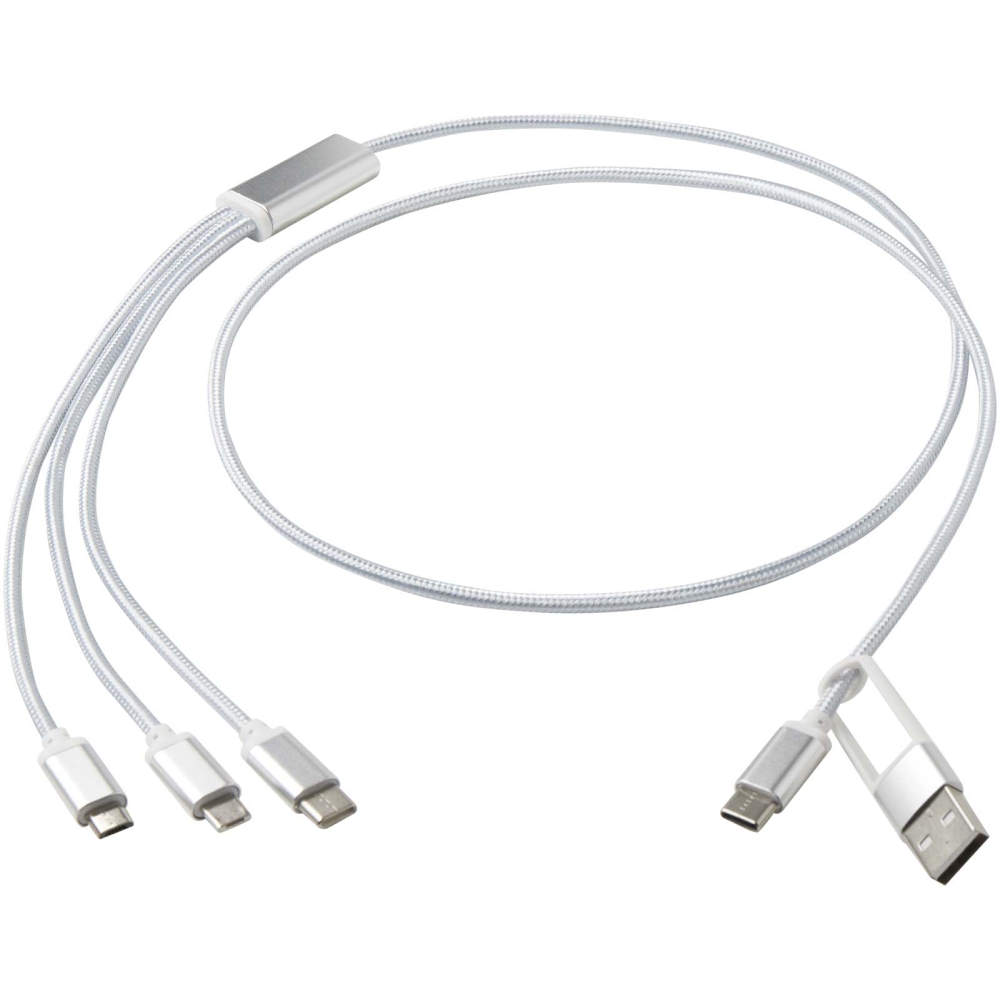 This cable features a USB-A and a Type-C input connector combined with a Type-C, a Micro USB and a Lightning/Micro USB combi output connector. Thanks to all these connectors you can charge most iOS/Android smartphones, cameras, power banks, and earbuds. The cable length is 100 cm and is made from recycled aluminium and RPET. Dimensions: 104 x 0,7 x 1,6 cm