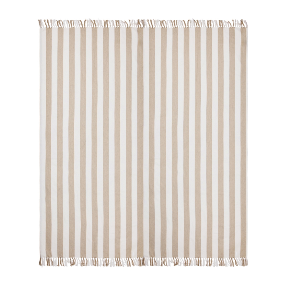 This family hammam beach towel features a classic two-colored striped pattern with fringes on the short sides. With its generous 180×180?cm, it’s perfect for sharing with loved ones, whether you’re relaxing at the beach or lounging by the pool. Crafted from a lightweight and airy 200 gsm blend, it combines the comfort of cotton with the quick-drying benefits of polyester. Certified by GRS (Global Recycled Standard), GRS certification guarantees that the entire supply chain of the recycled materials is certified. The total recycled content is based on the overall product weight. This product contains 70% GRS certified recycled cotton and 29% GRS certified recycled polyester.Dimensions: 180 x 180 cm