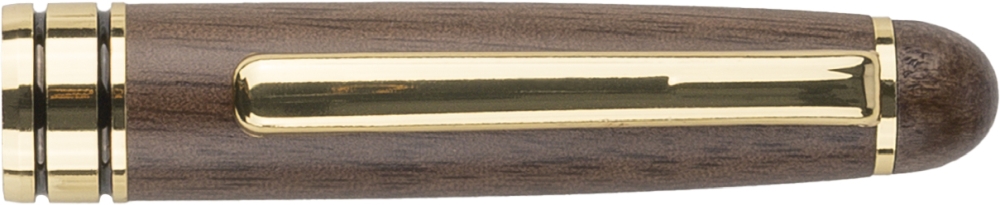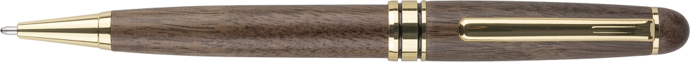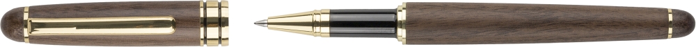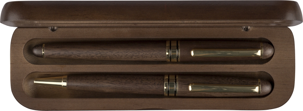 Walnut wood and brass pen set with twist ballpen (approx. 1,000 meters) and rollerball (up to 400 meters), both with blue German Dokumental ink. Ballpen features metal tip, clip, and trim. Packaged in maple wooden box and brown cardboard box. Dimensions: 2,6 cm x 17,3 cm