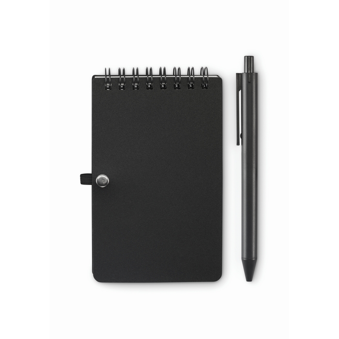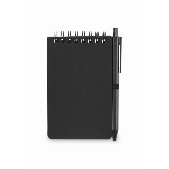 Water repellent notepad in PP cover with pen. Twin-wire. Mineral paper 120 gr/m2, 50 sheets lined. Blue ink. Elastic closure strap and pen holder. Rozměry: NOTEBOOK12.7 x 8 cm.BALLPEN14 x 1 cm