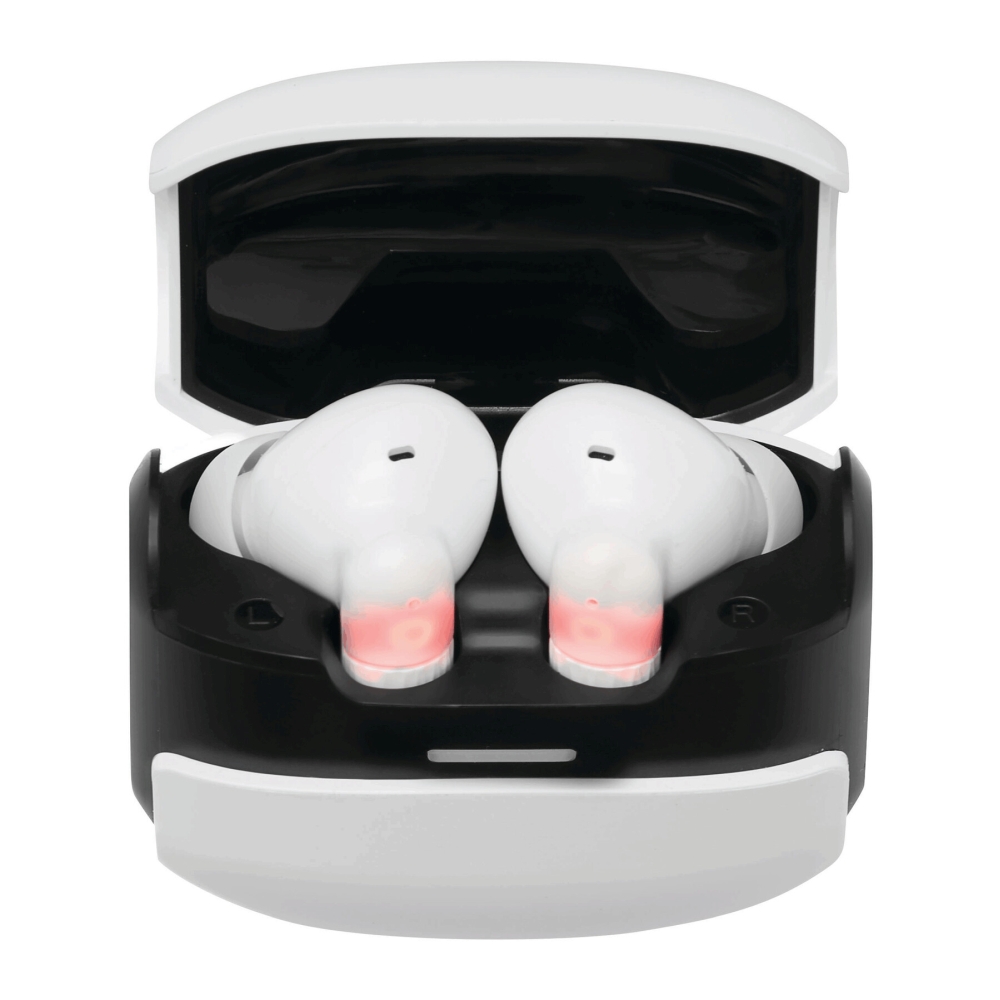 Wireless in-ear headphones with hands-free function, compatible with Bluetooth®, range approx. 10 m, multifunction button for call acceptance and termination as well as play/pause, next/previous track, and volume control (up/down), can also be used individually, incl. USB charging cable with USB Type-C connector (length approx. 20 cm), red charging control LED, storage case also serves as a charging station, capacity headphones: 28 mAh, charging case: 150 mAh, packed in a gift box. Dimensions: 5,3 x 4,8 x 3,2 cm