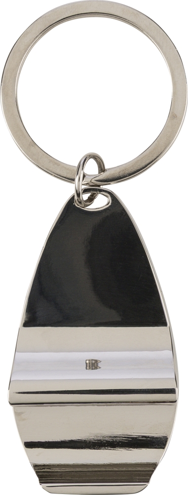 Zinc alloy keychain with metal keyring and bamboo inlay on the front. Features a bottle opener function. Packed in a paper bag. Dimensions: 10 cm x 52 cm
