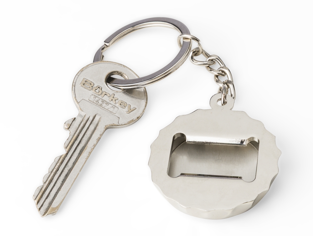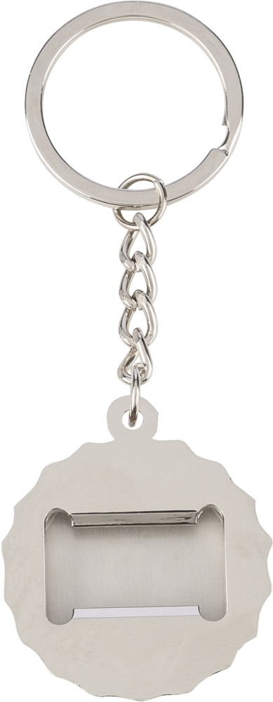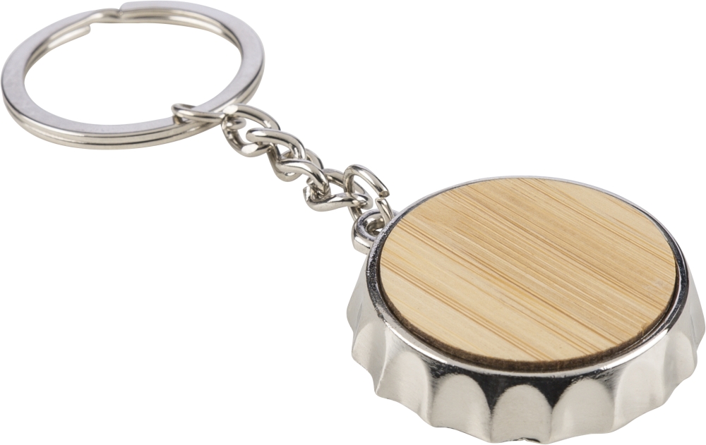 Zinc alloy keychain with bamboo inlay on the front and integrated bottle opener on the back. Features a metal keyring and is packaged in a paper bag. Dimensions: 3,8 cm x 7,1 cm