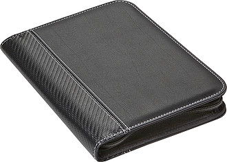 A5 Document folder with PU cover with zipper, white stitching, elasticated pen loop, six pockets of various sizes, lined writing block (thirty sheets) and microfibre lining. Pen not included.