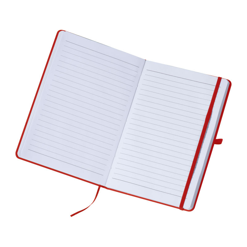 A5 notebook with 160 lined pages and hard cover made of PU for notes. With black bookmark and rubber strap. We will print your logo on the cover. Dimensions: 14 x 21 x 1,3 cm