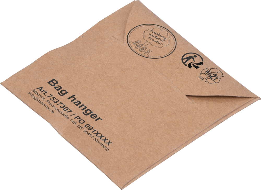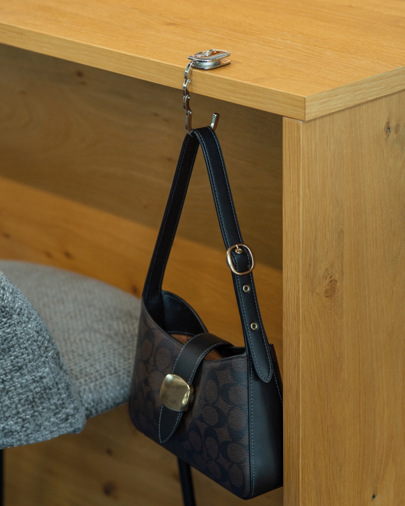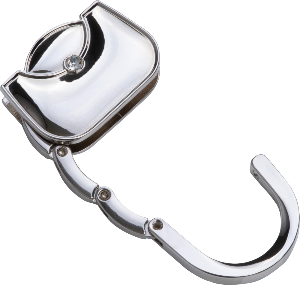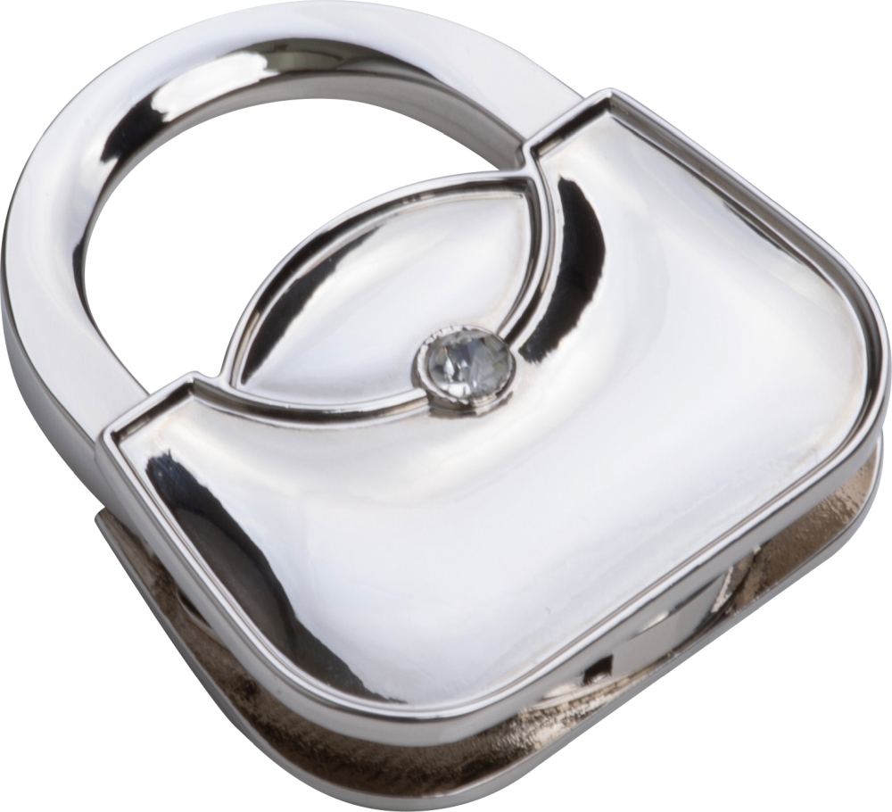 Metal bag holder in the shape of a handbag. Simply unfold the hook, place the holder on the edge of a table, and hang your bag on the hook. Dimensions: 4,3 x 1 x 4,9 cm