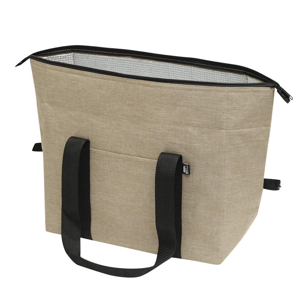 Cooler bag POLAR: made of recycled plastic (RPET), insulated main compartment with 2-way zip, 1 slip-in pocket on the front, reinforced carrying handles, expandable storage space by unsnapping top edges of the bag from the webbing loop attached at each side. Dimensions: 60 x 19 x 44 cm