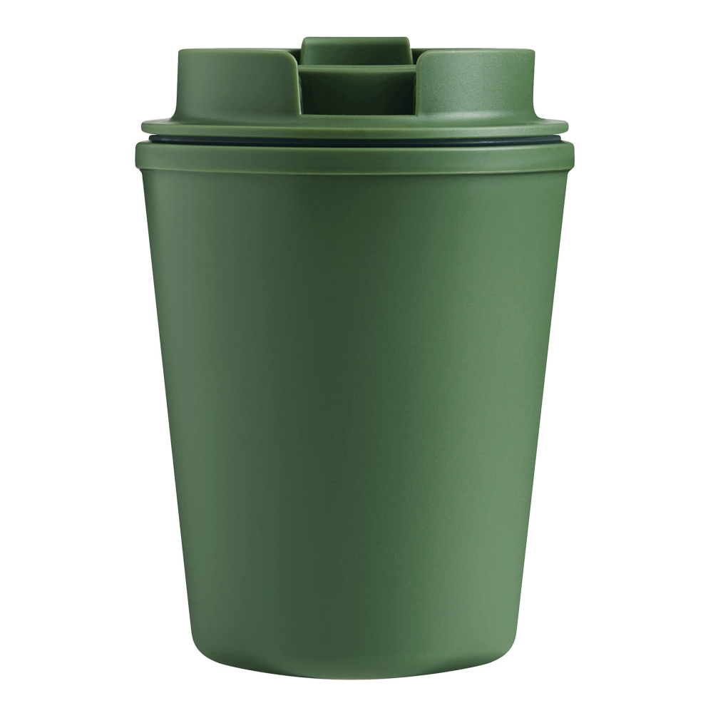 Insulated mug, double-walled: inside and outside made of plastic, secure screw cap with silicone seal and integrated fold-out drinking opening, capacity approx. 350 ml, keeps warm for approx. 2 hours and cold for up to 4 hours. Dimensions: O9,2 x 13 cm