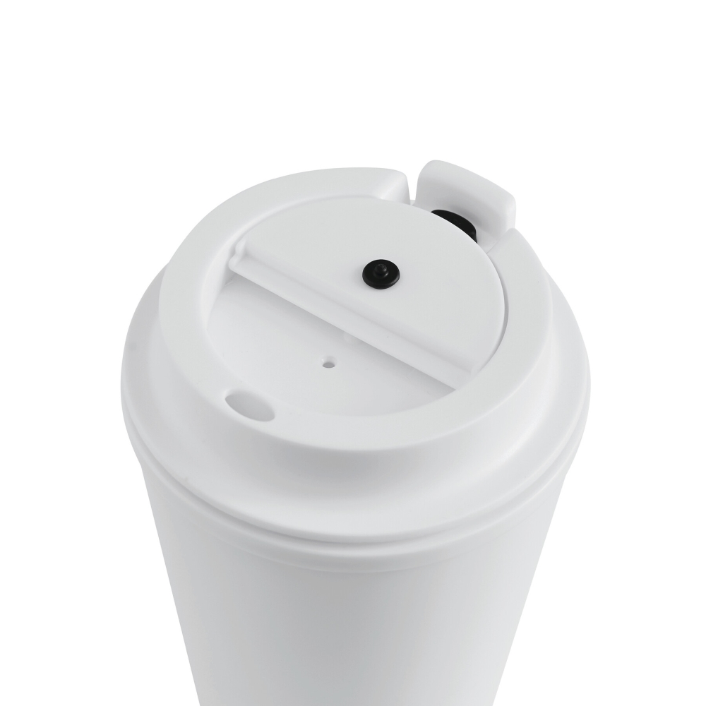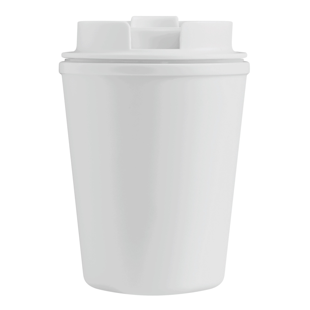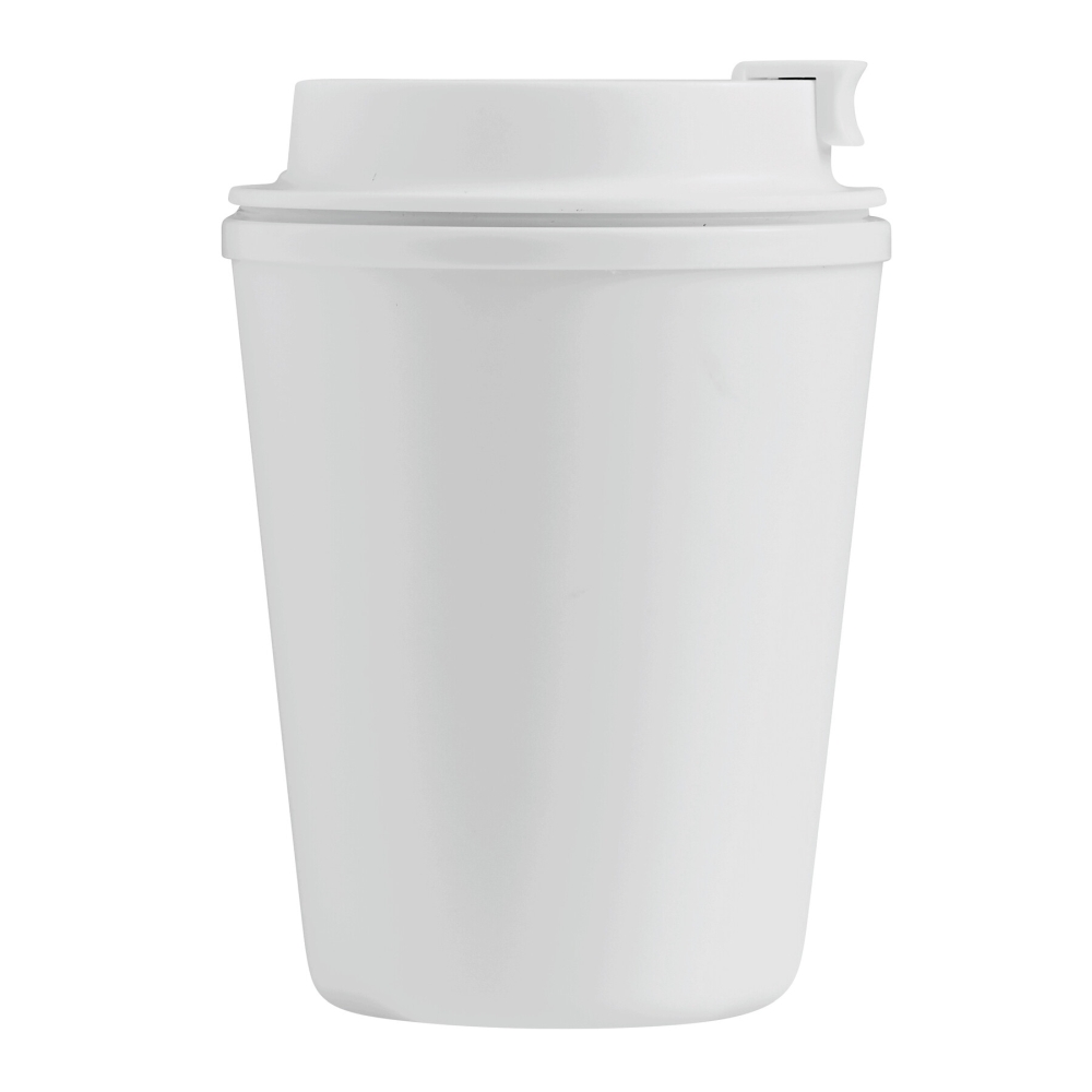 Insulated mug, double-walled: inside and outside made of plastic, secure screw cap with silicone seal and integrated fold-out drinking opening, capacity approx. 350 ml, keeps warm for approx. 2 hours and cold for up to 4 hours. Dimensions: O9,2 x 13 cm