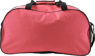 Polyester (600D) sports bag with large main compartment and zippered pocket on the side.