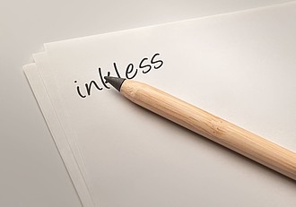 Long-lasting bamboo inkless pen with bamboo barrel and eraser on top with paper cap. The pen writes with the metal alloy tip.