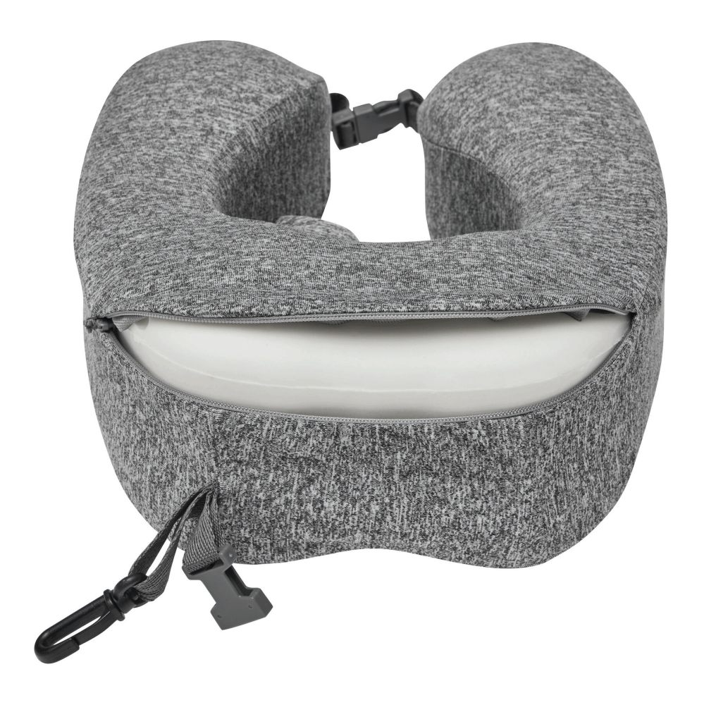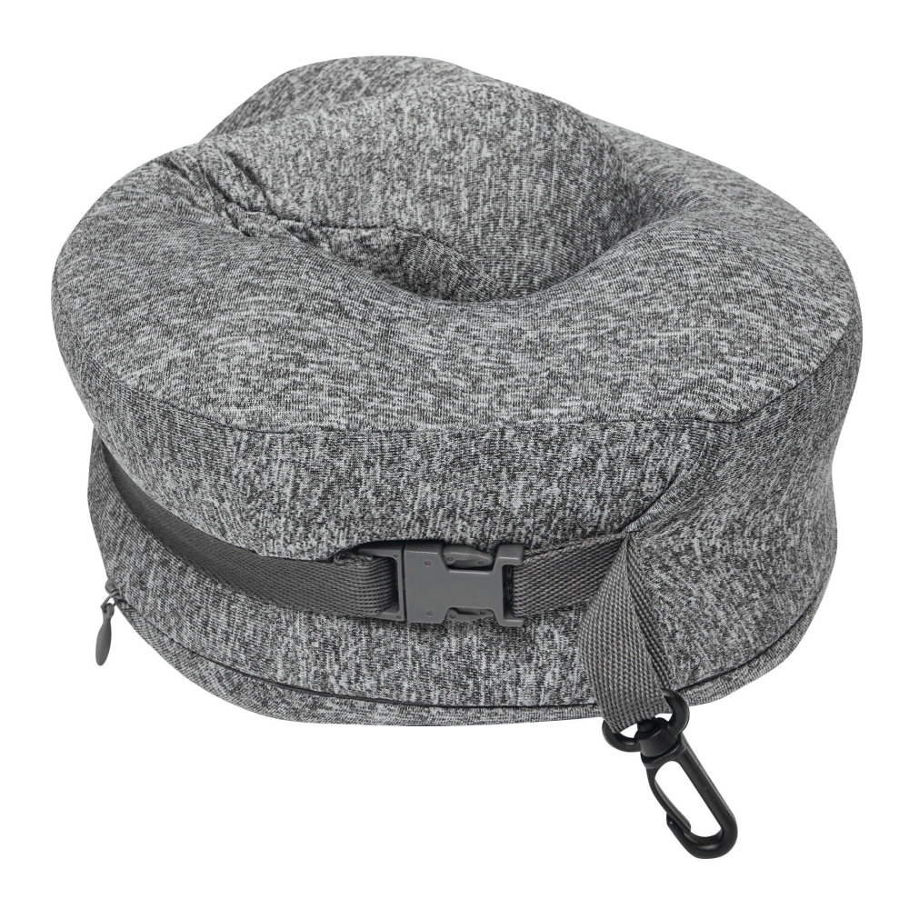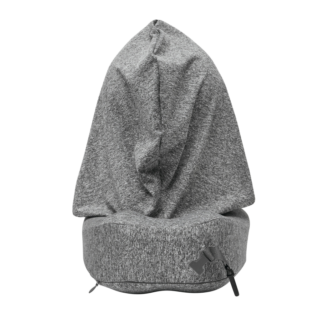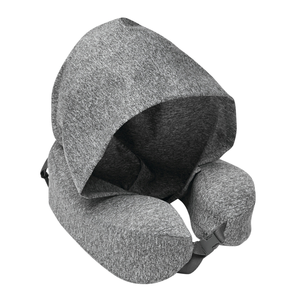 Memory foam neck pillow with integrated hood to cover head and face, with adjustable snap closure, removable and washable jersey cover, filled with memory foam for optimal comfort, loop with small carabiner for hanging up or attaching during transport (the carabiner is NOT suitable for climbing), neck pillow can be rolled up and closed with a snap closure to save space. Dimensions: 28 x 22 x 10 cm